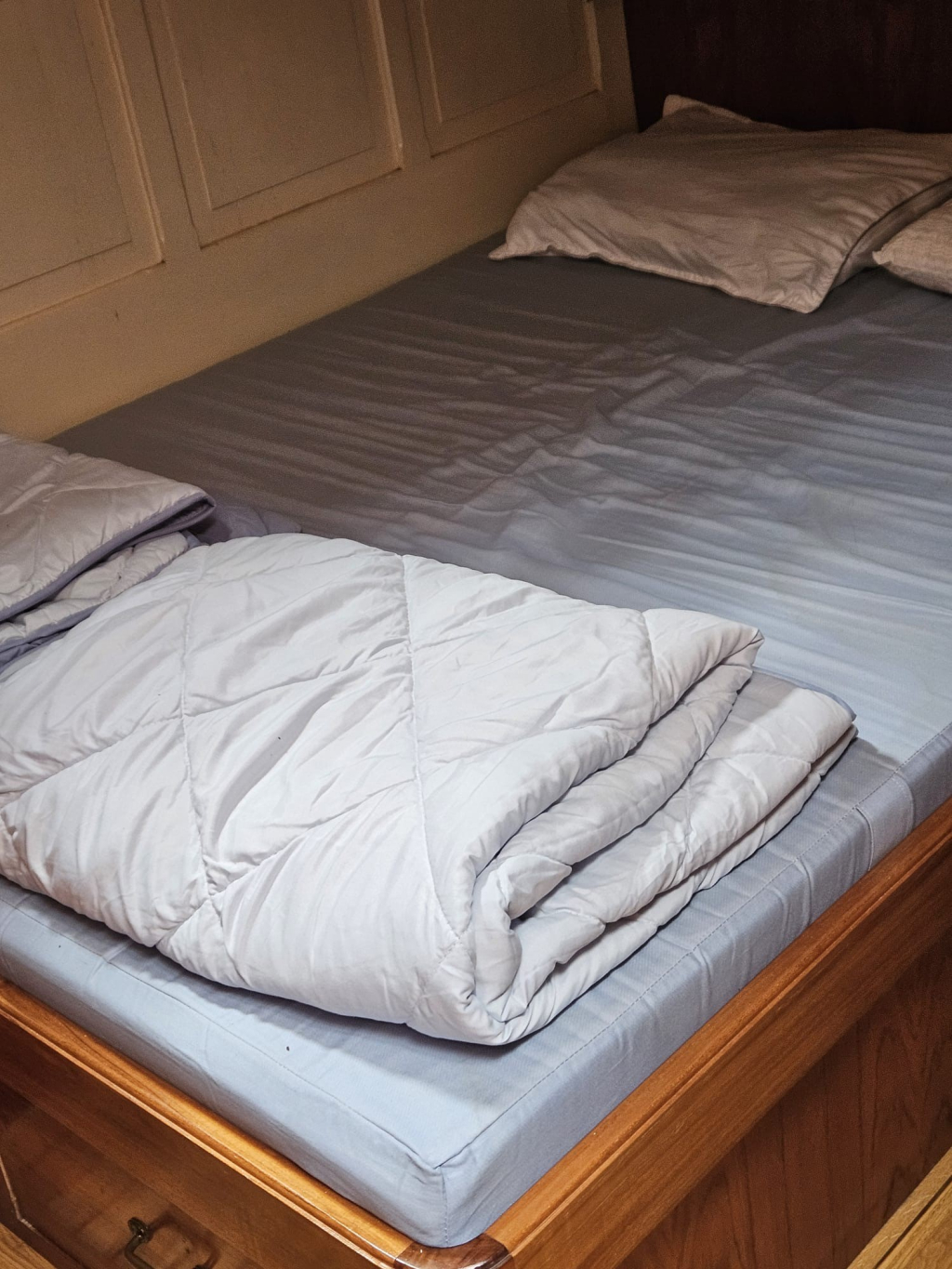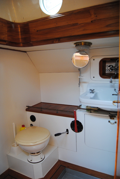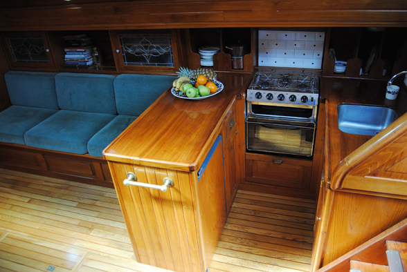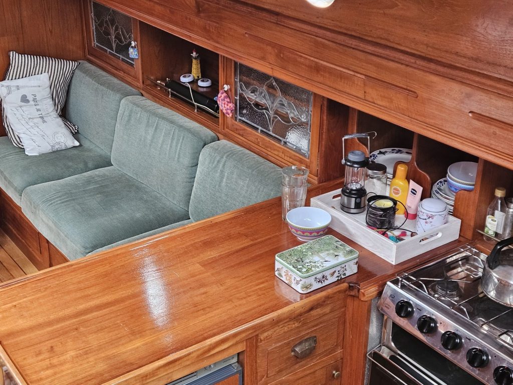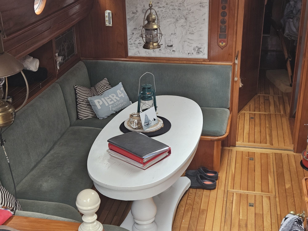 Het interieur is ruim van opzet, comfortabele stahoogte (200 cm) met 3 gescheiden hutten. Kombuis in u-vorm met veel kastruimte. Ruim toilet met douche. Goed bemeten slaapplaatsen. De afwerking met paneeldeuren geven een luxueuze, scheepse uitstraling.