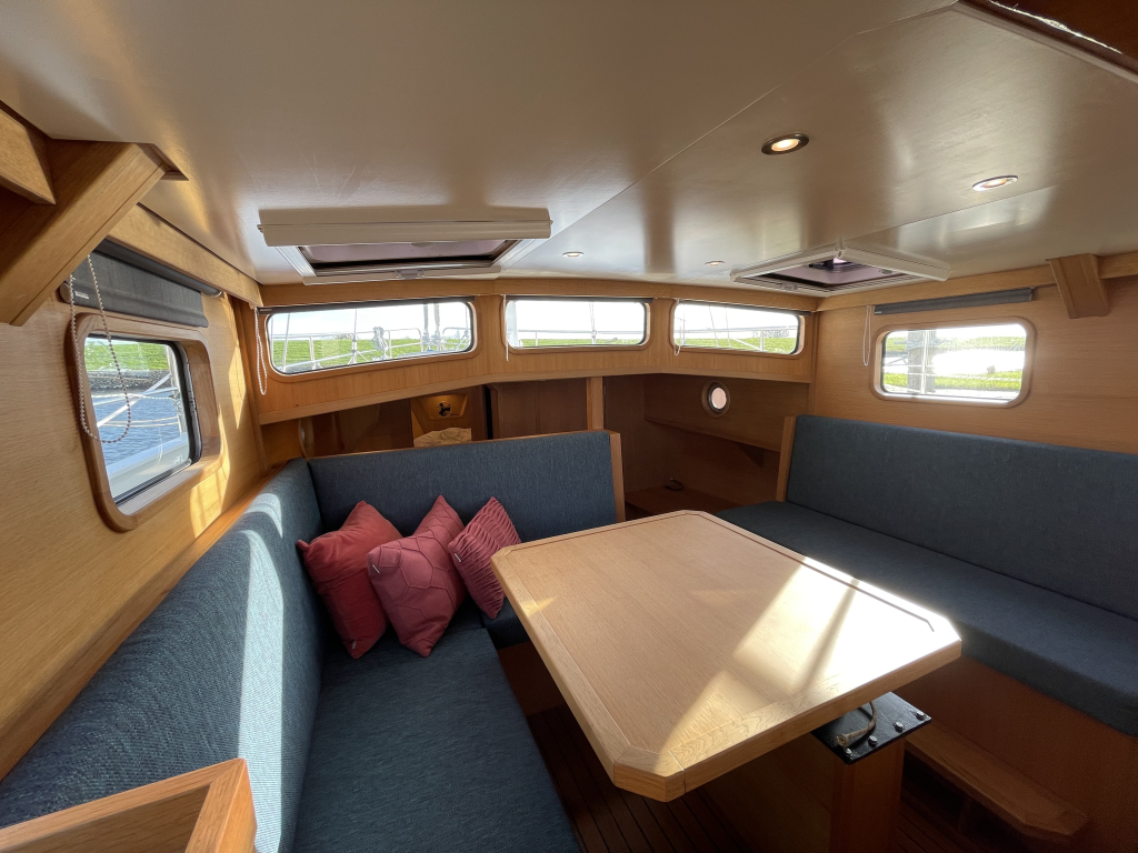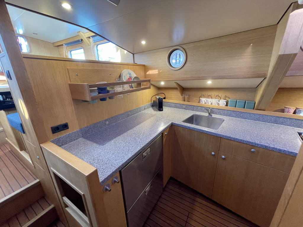 Het vernieuwde interieur straalt vakmanschap en rust uit. De ruime salon is voorzien van fraaie eiken betimmering, comfortabele zithoek en een praktische kombuis met alle voorzieningen voor langere reizen.