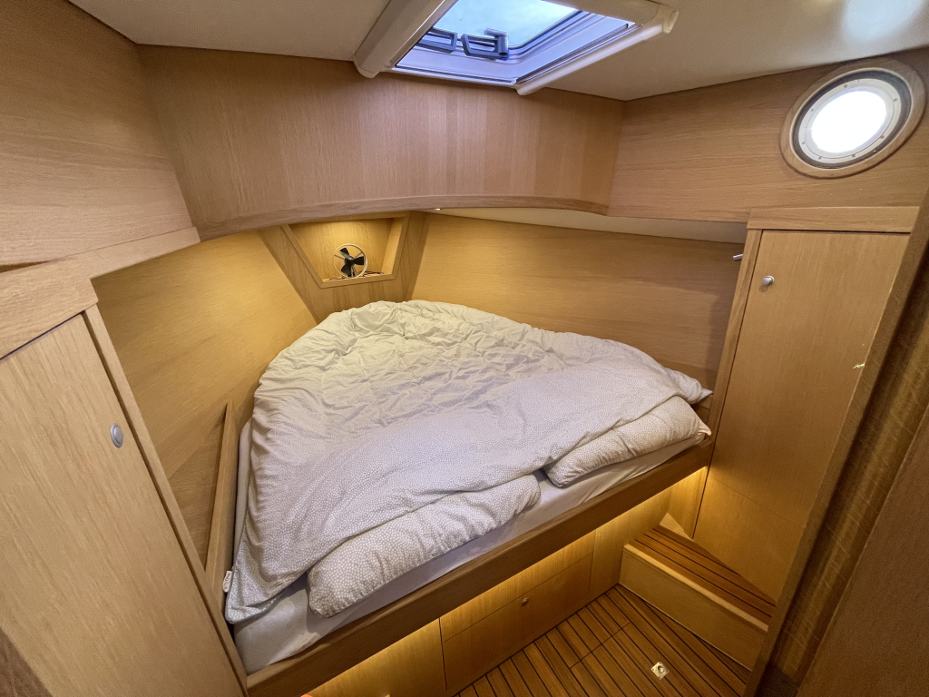 De kajuiten bieden volop bergruimte en slaapcomfort. Dankzij de goede isolatie en ventilatie is het schip geschikt voor vierseizoenengebruik – van zomerse tochten tot overwinteren aan boord.