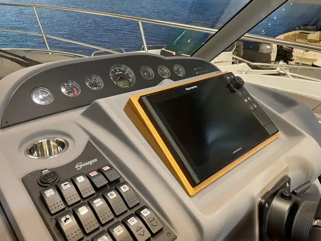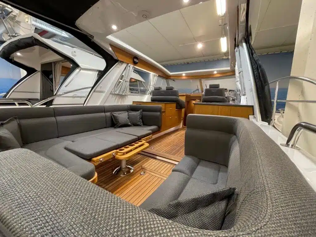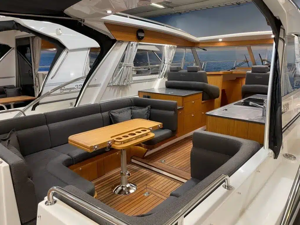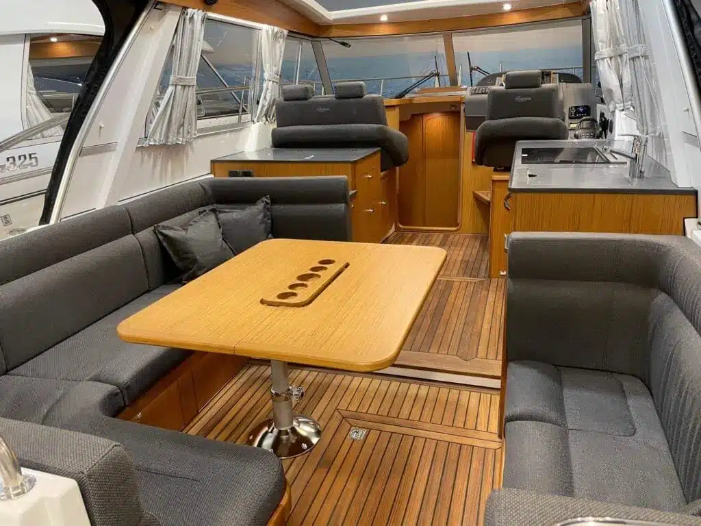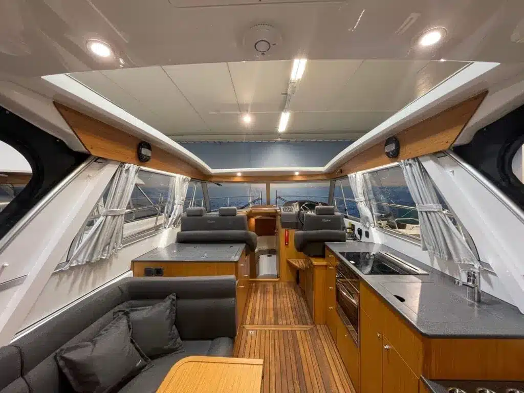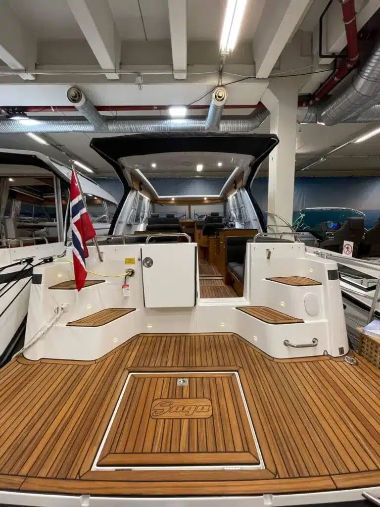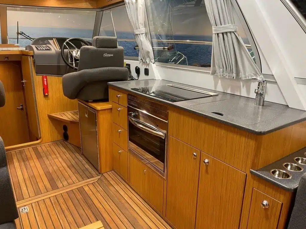 De nieuwe versie van de Saga heeft een nog fraaiere afwerking dan de voorgaande modellen. Het dashboard is ergonomisch gevormd en er is ruim voldoende plaats voor een volledige navigatie. De kuip is in directe verbinding met de salon. U kunt dit schip als een ergonomisch concept beschouwen. Dergelijke details vindt u ook aan dek zoals bijvoorbeeld een hoge railing.