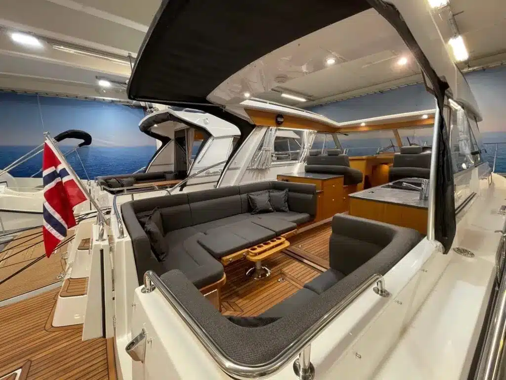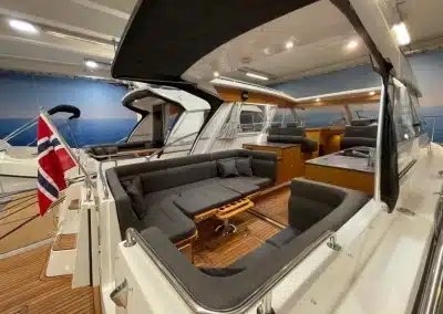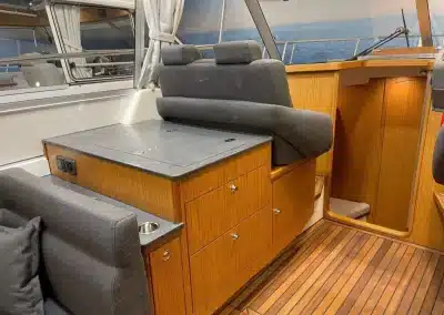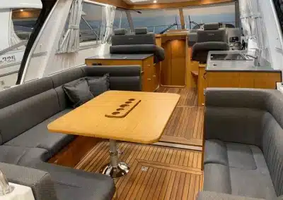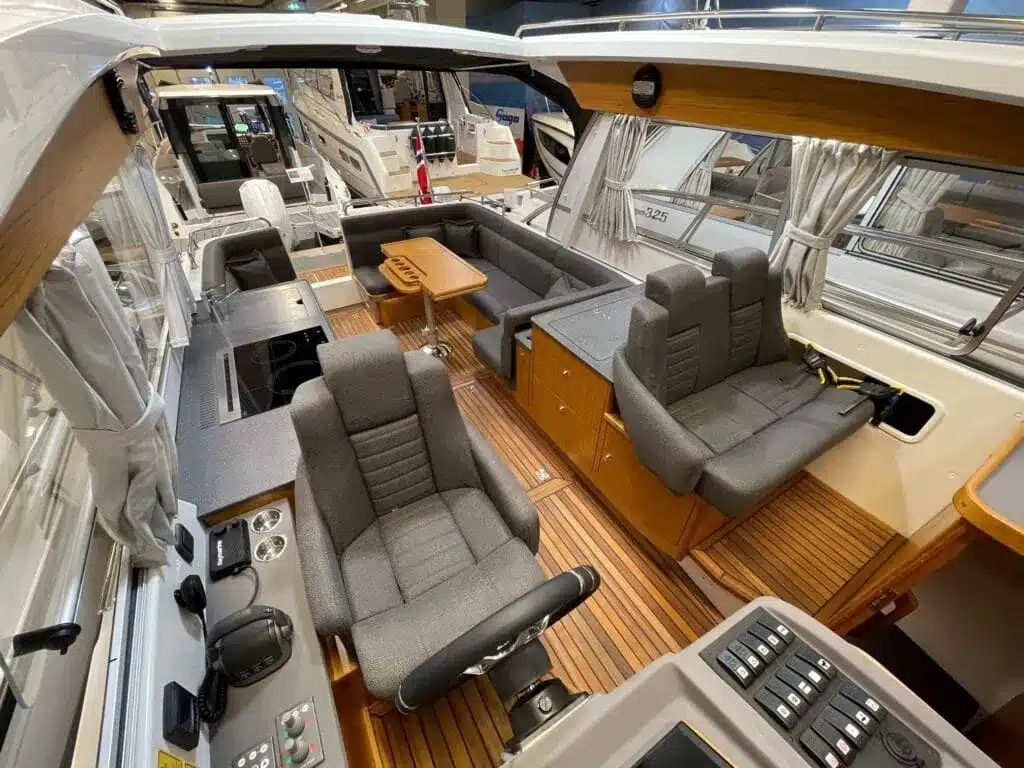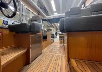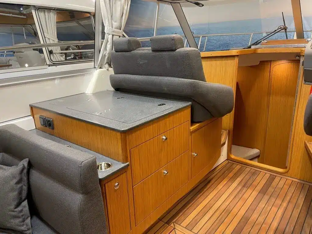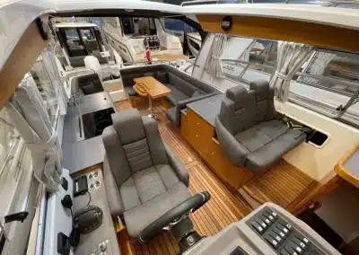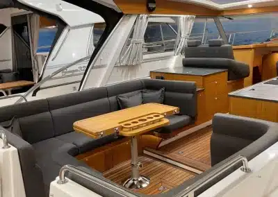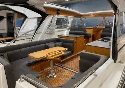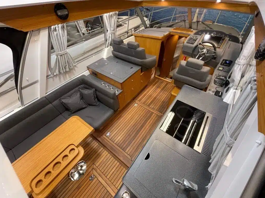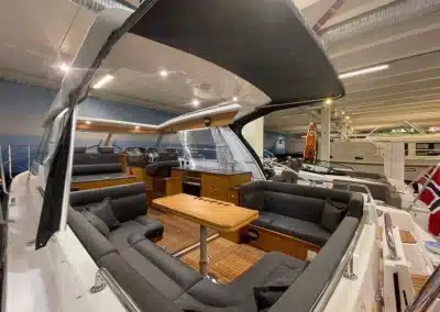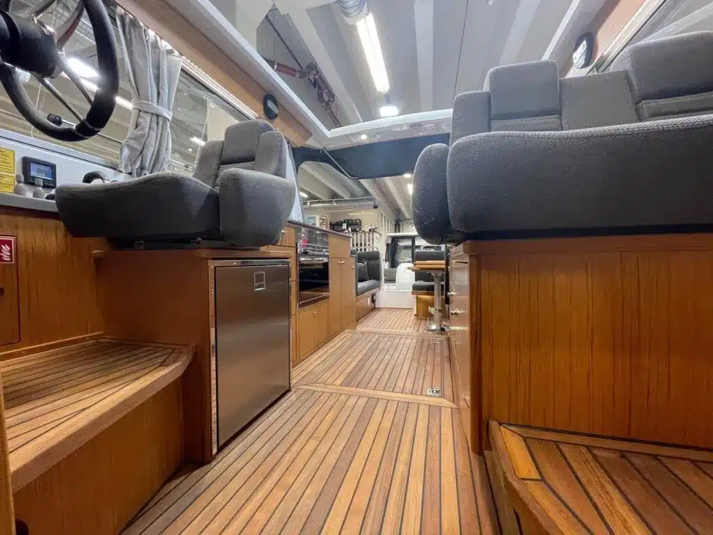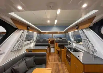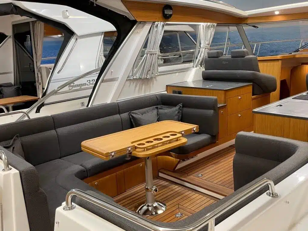 De nieuwe versie van de Saga heeft een nog fraaiere afwerking dan de voorgaande modellen. Het dashboard is ergonomisch gevormd en er is ruim voldoende plaats voor een volledige navigatie. De kuip is in directe verbinding met de salon. U kunt dit schip als een ergonomisch concept beschouwen. Dergelijke details vindt u ook aan dek zoals bijvoorbeeld een hoge railing.