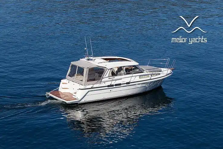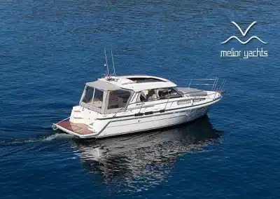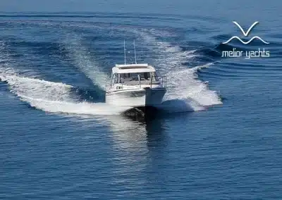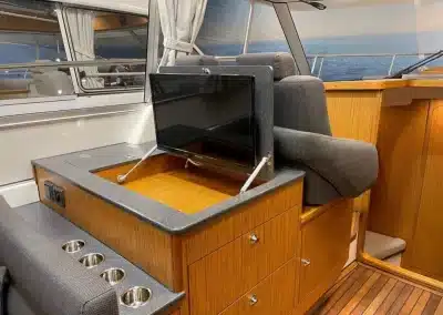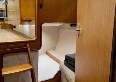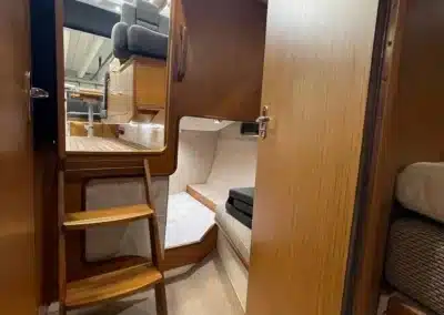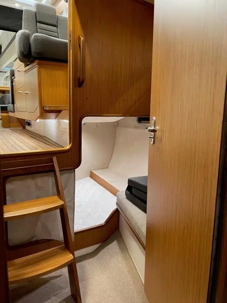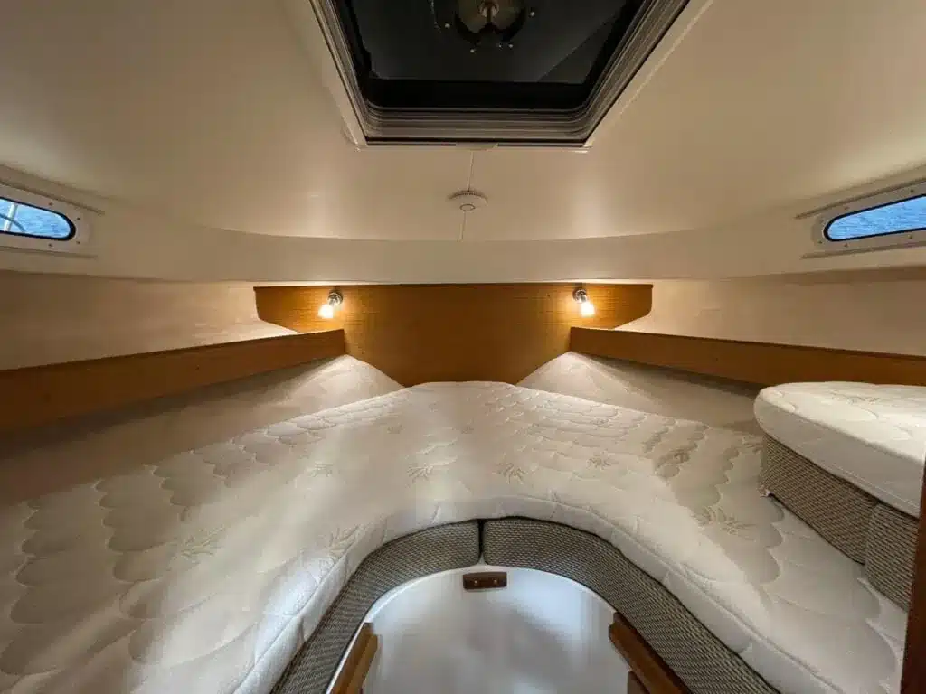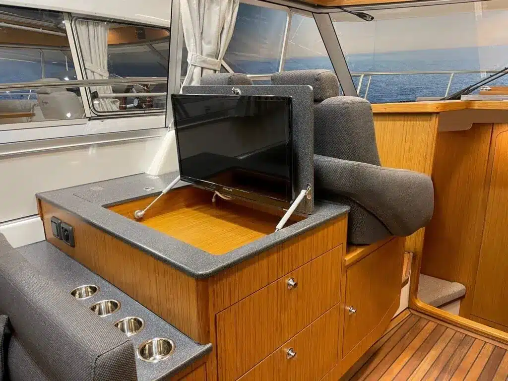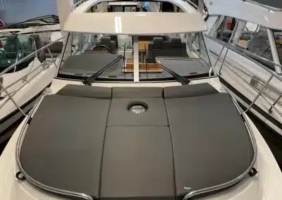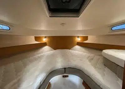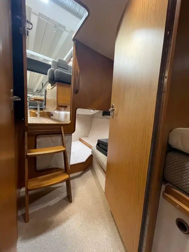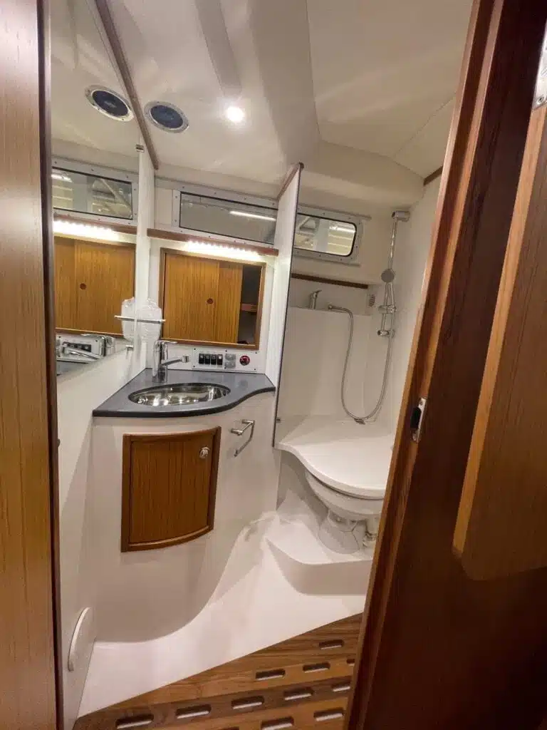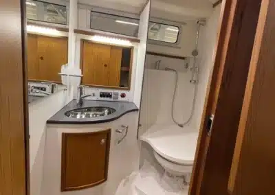 Benedendeks vindt u twee dubbele cabines en badkamer met elektrisch toilet en douche. De grote voorruit met hardtop geeft een goed beschermde omgeving. Het salondak is elektrisch te openen!