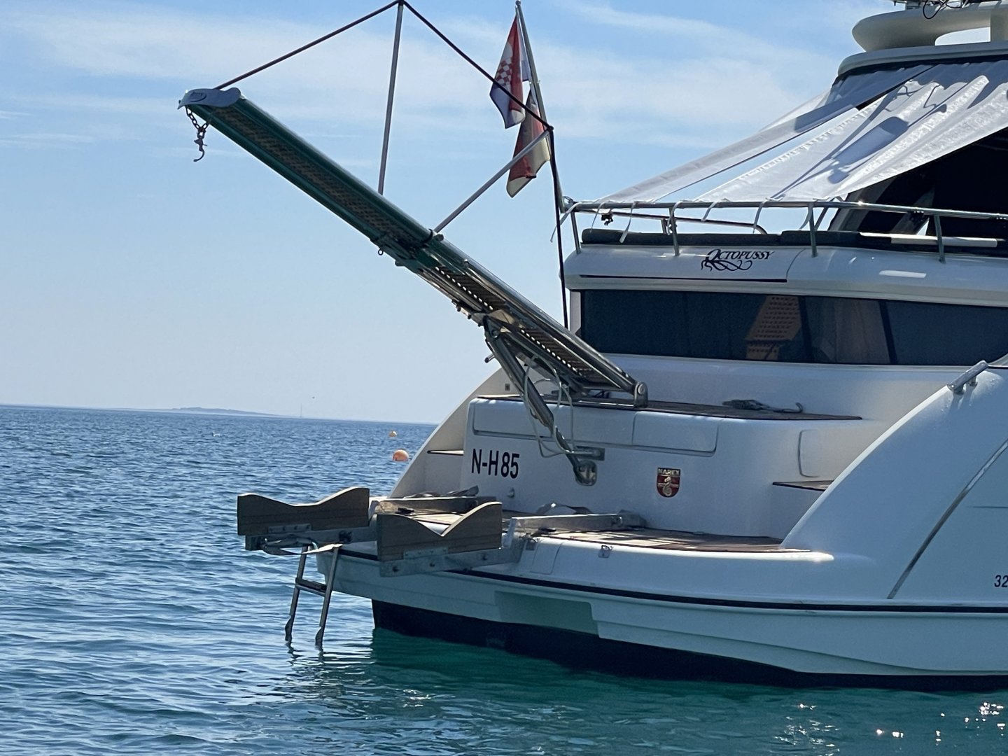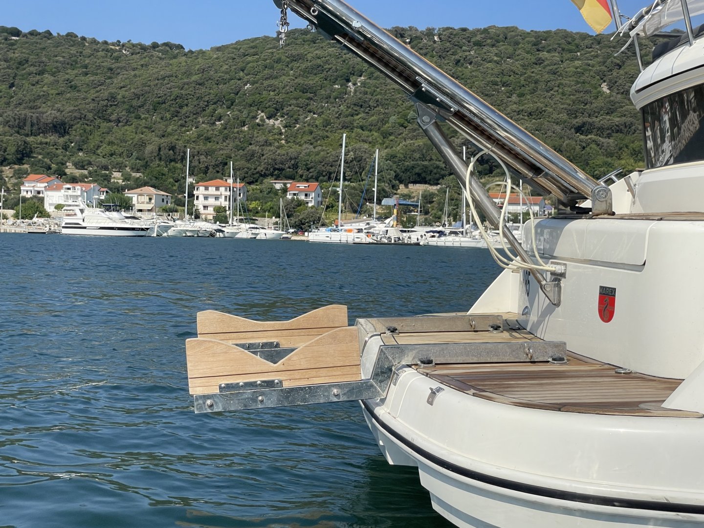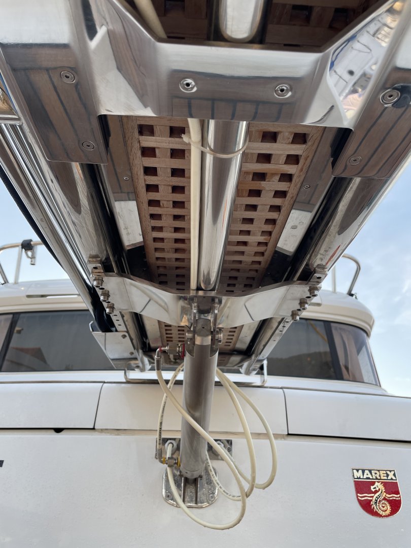 Dubbele zeerailing, zoeklicht zwekbaar/kantelbaar en met afstandbediening, rvs ophangsysteem voor bijboot tot 150 kg, hydrualische loopplank nieuw ingebouwd in 2022, onderwaterverlichting.