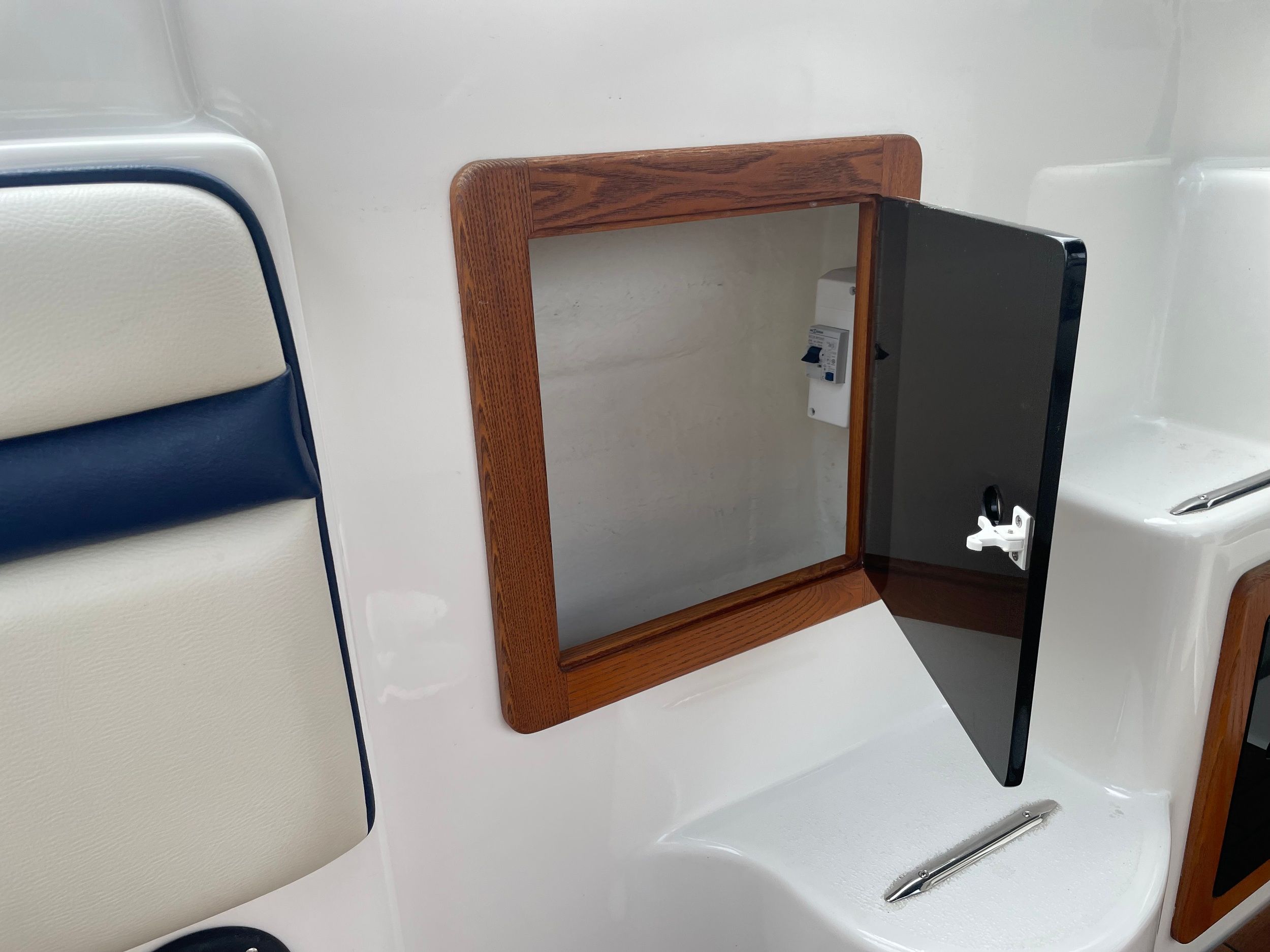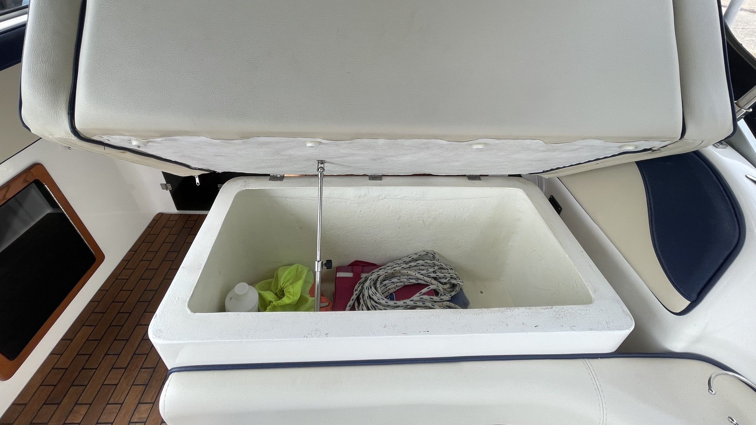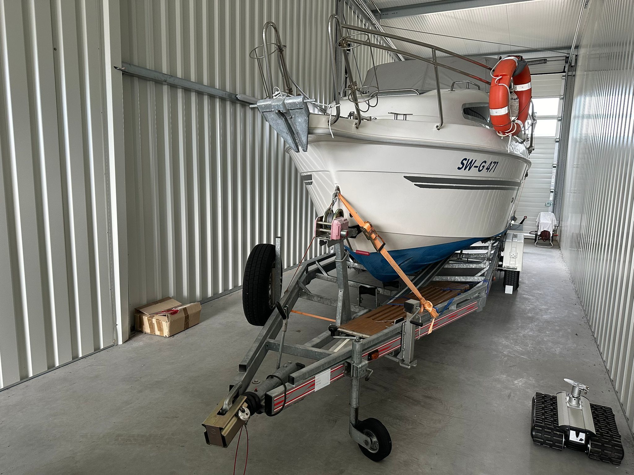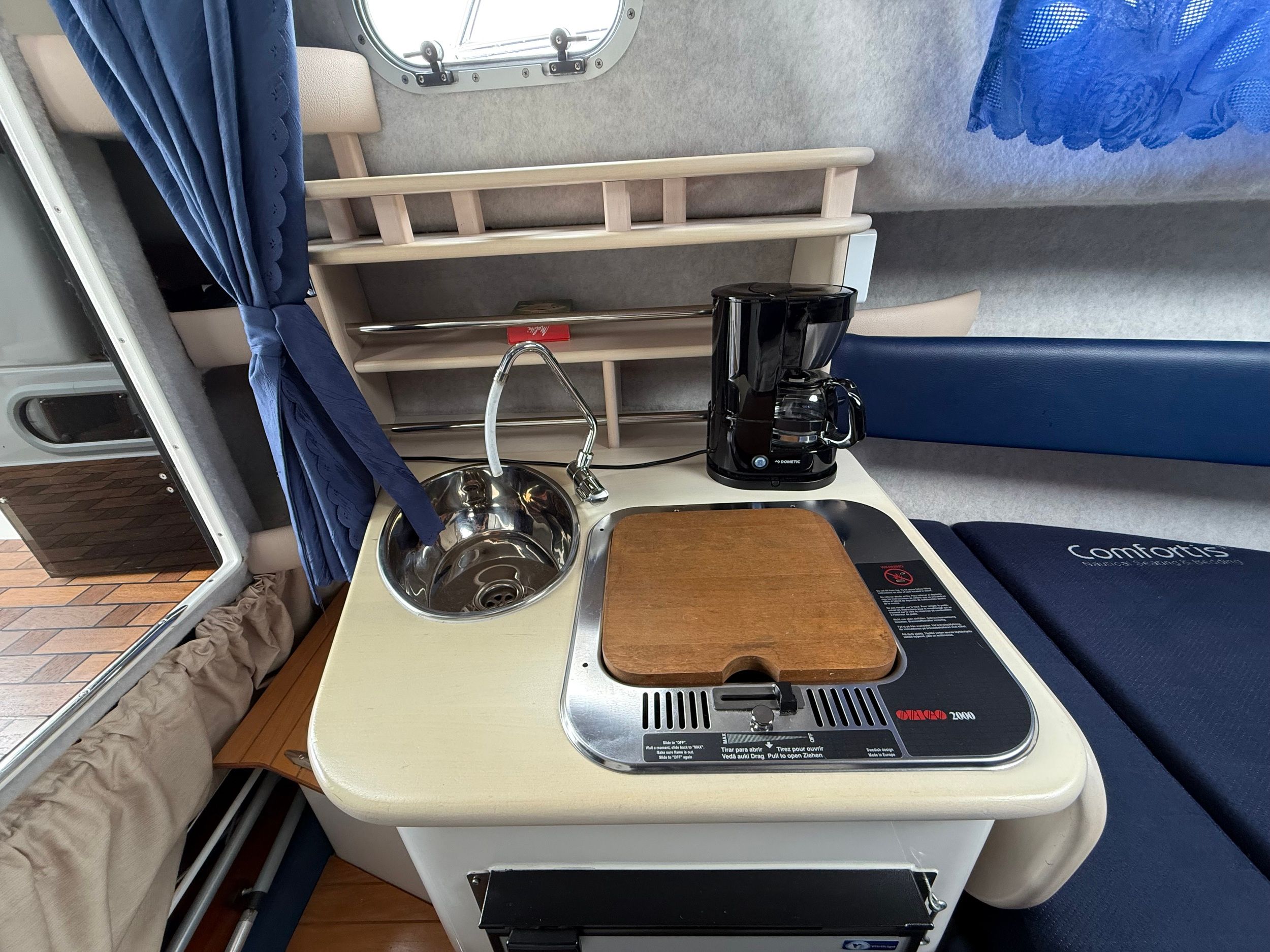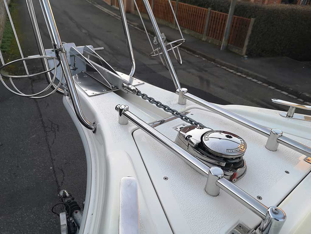 Transportzeil, handgreep over het kajuitdak VA, teakdek voor kuip en kajuit, drank- en flessenhouder, binnenverlichting in kuip en kajuit, veel bergruimte met kleppen of hoezen, verhoogde VA-zeerailing, 2 opklapbare VA-middenkikkers. Ladder voor luik en beugel, 2 fenderkorven VA voor. Speciale handgreep voor uitstappen met extra opstap linksbuiten.