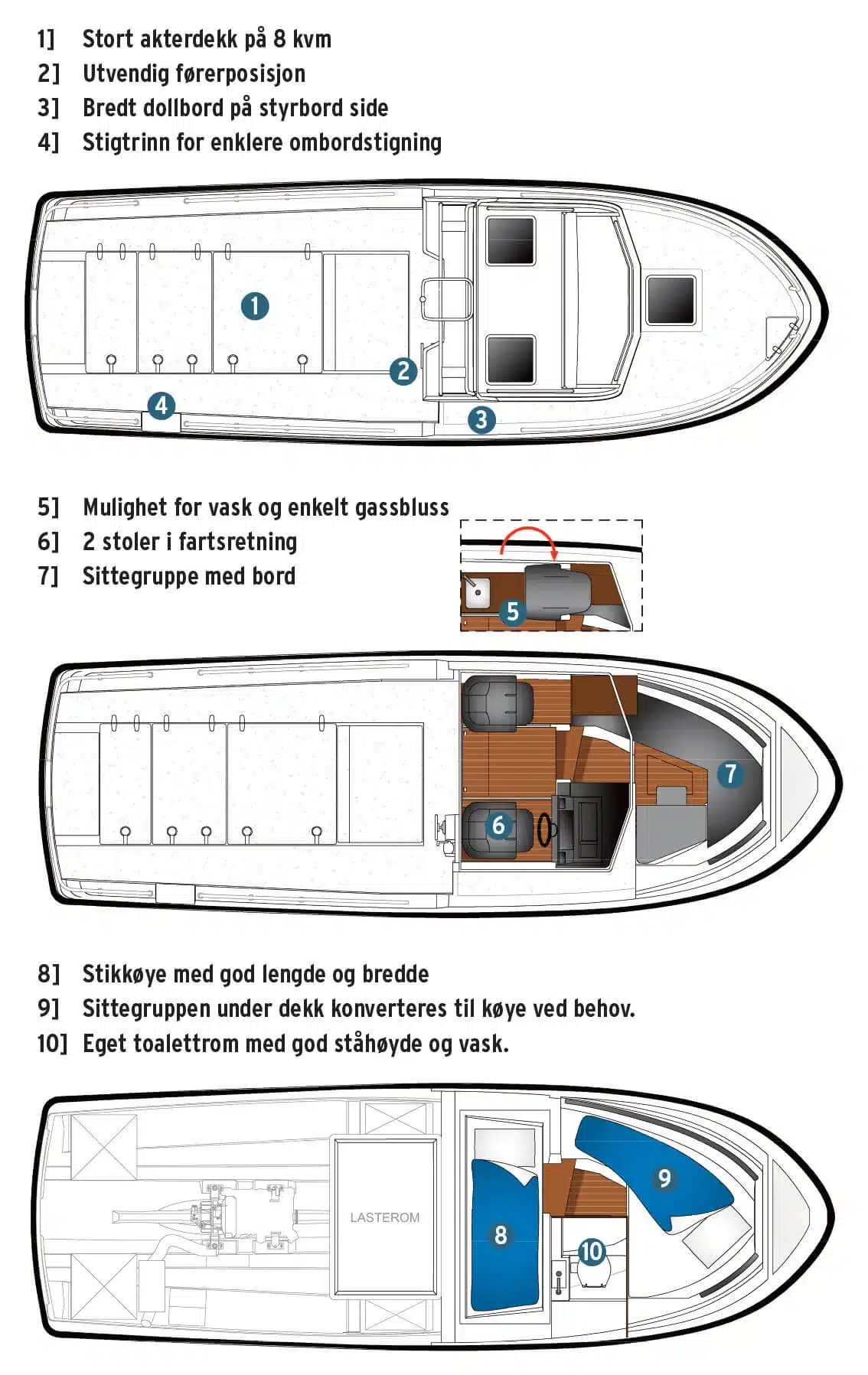 Met een indrukwekkend achterdek en een romp met snelheidspotentieel is dit de jacht voor de actievelingen. Past perfect in de kajuit voor zowel vrijetijdsbesteding als vissen, duiken en waar behoefte is aan vervoer. Natuurlijk heeft de jacht alle kwaliteiten en oplossingen die de moderne en actieve gebruiker zich kan wensen. Welkom aan boord.